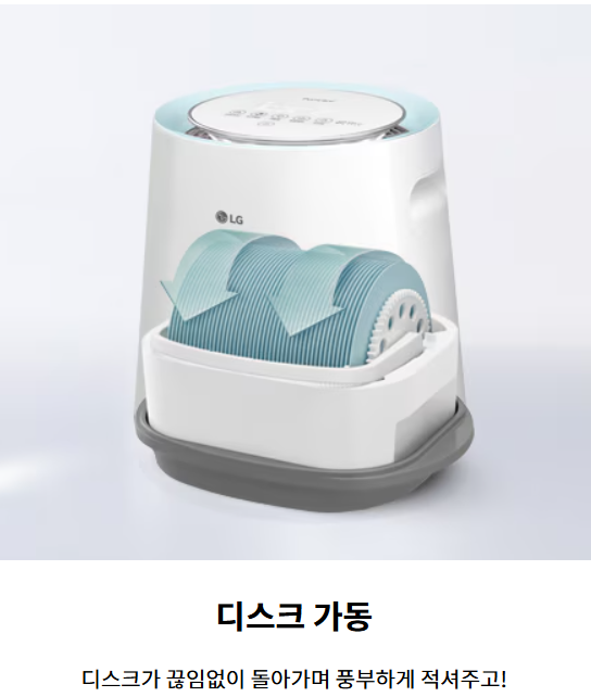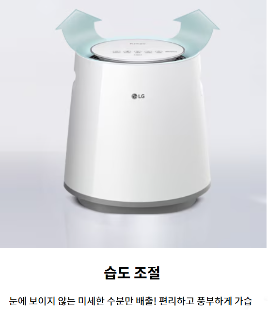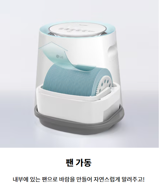 - 작동 원리: 필터를 통해 물을 흡수하고 공기를 순환시켜 자연 증발(그림 참조, 출처: LG).