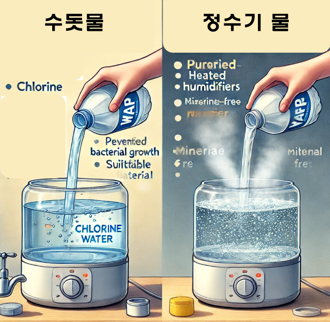 - 정수기 물: 미네랄이 제거되어 깔끔하며, 가열식 및 자연기화식에 추천.