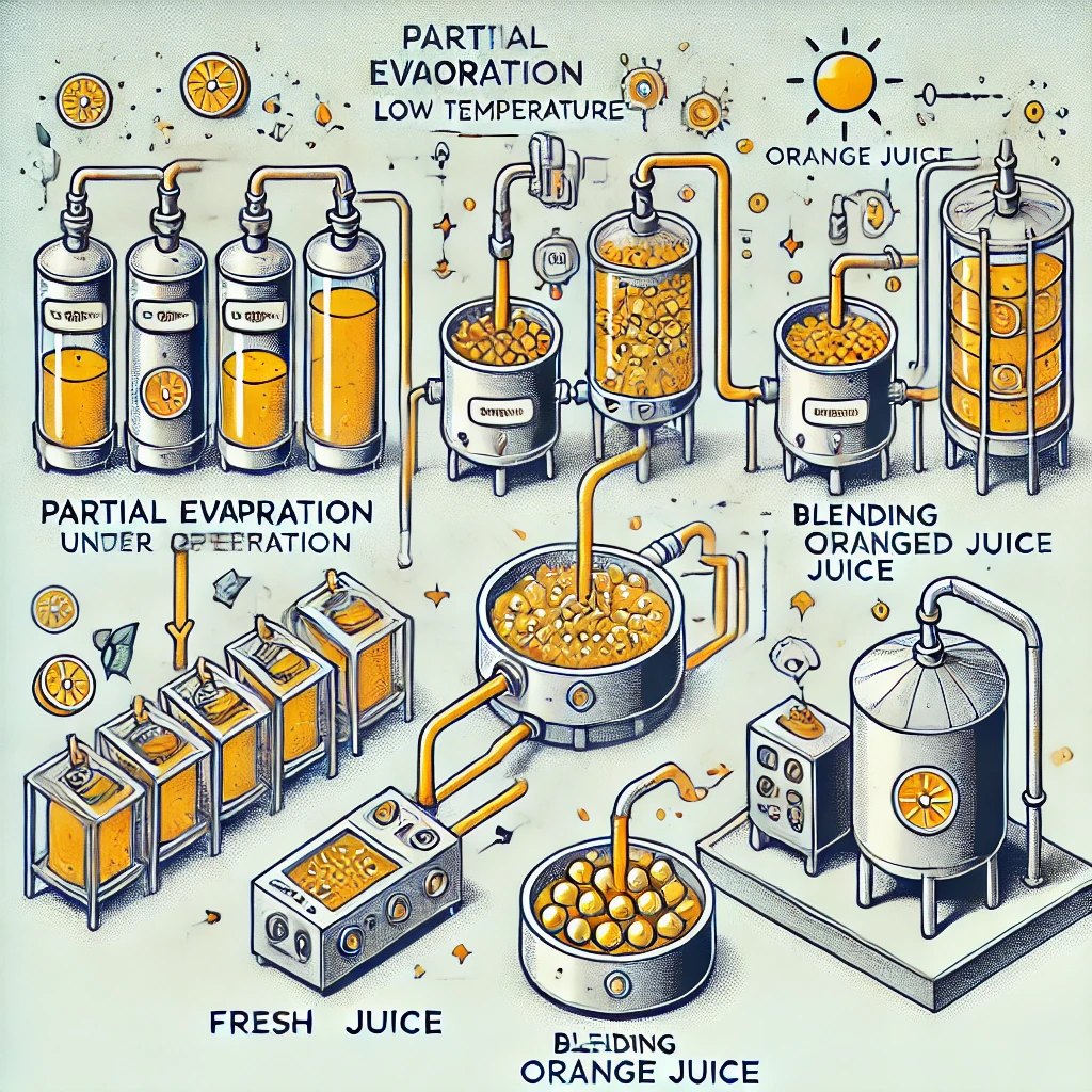 - 신선한 주스와 혼합: 증발 과정을 거친 농축 주스에 신선한 오렌지 주스의 일부를 섞었습니다. 이 과정을 통해 신선한 주스의 맛과 향을 회복하면서도 보존성을 높일 수 있었습니다.