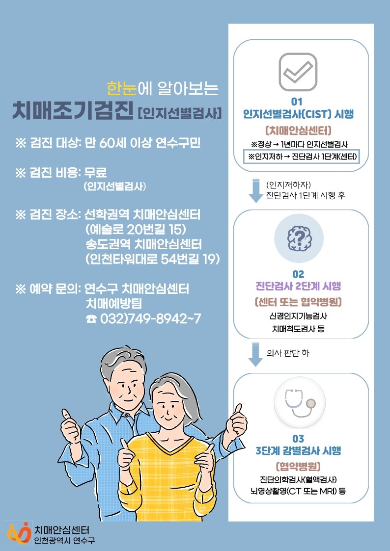 치매는 조기 발견이 중요합니다. 60세 이상 어르신들은 보건소에서 1차 치매 선별 검사를 무료로 받을 수 있습니다. 검사 결과에 따라 정밀 진단 및 관리 프로그램이 제공되며, 치매 환자와 가족을 위한 돌봄 서비스 및 상담도 지원됩니다.