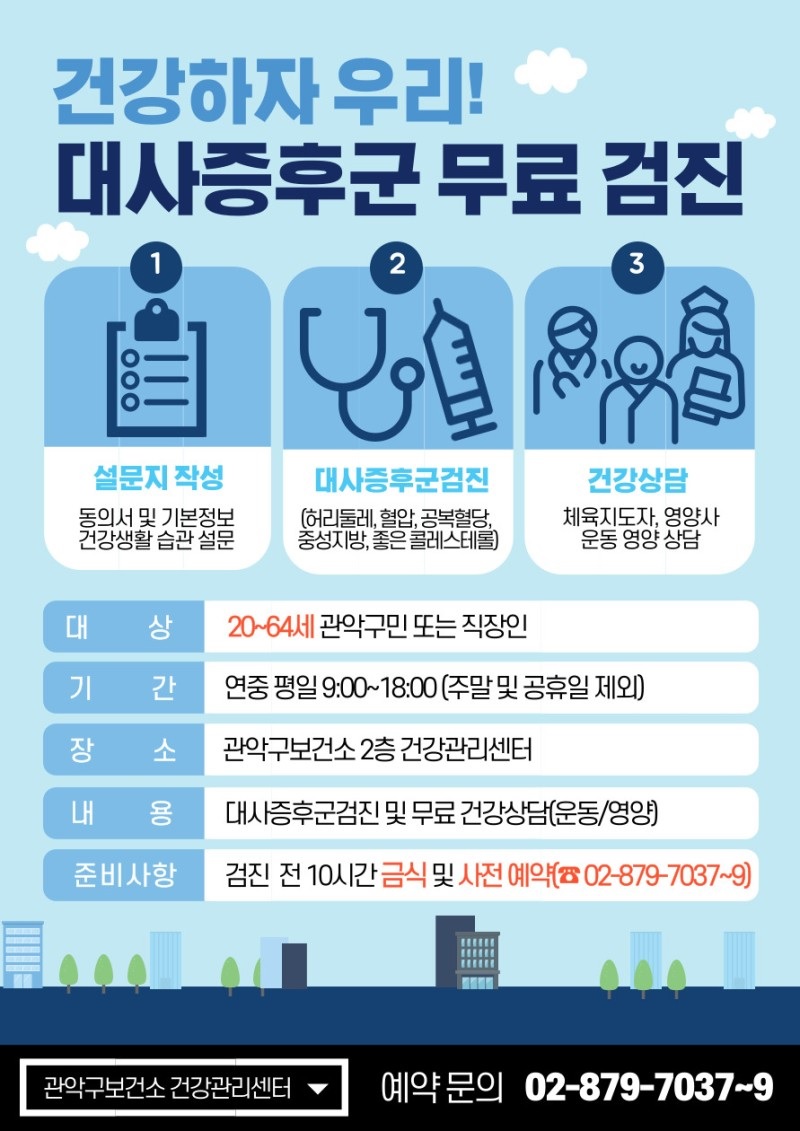 보건소에서는 골밀도 검사, 혈압 측정, 혈당 검사 등 주요 질환에 대한 검진을 무료로 제공합니다. 대사증후군 검진을 통해 고혈압, 당뇨, 고지혈증 등을 조기에 발견하고 예방할 수 있습니다. 검진 후에는 건강 관리 상담과 예방 교육도 진행됩니다.