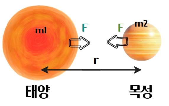 태양과 목성은 중력에 의해 서로를 당기고 있습니다. 이 힘을 계산하기 위해 뉴턴의 중력 법칙을 사용합니다.