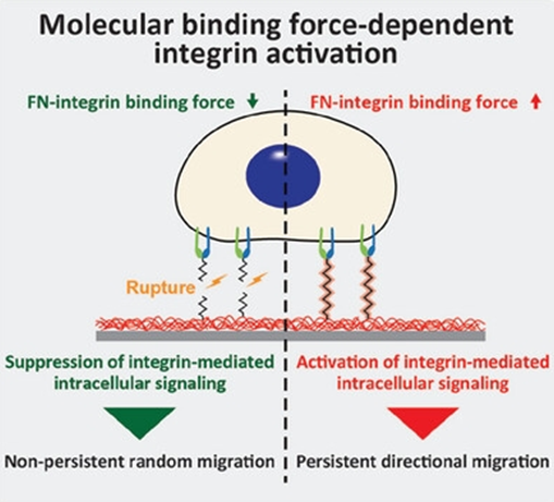 ※ 심장 박동, 체액의 흐름, 피부 및 근육의 수축과 이완 등 체내에 자연적으로 발생하는 기계적 자극에 대응하는 세포 소기관의 자극 인지 메커니즘에 관한 연구 결과를 바탕으로 세포의 부착과 이동 현상을 제어할 수 있는 신기술을 개발했다. 연구팀은 정확한 서열을 알고 있는 DNA 두 가닥을 분리할 때, 힘을 가하는 위치에 따라 필요한 힘이 달라진다는 현상을 이용해, 피코뉴턴 (pN: 1조분의 1뉴턴) 크기에서 힘 조절이 가능한 분자 센서를 합성한 후 이를 코팅한 표면에서 세포의 거동을 조절하였다. 세포는 세포밖의 변화를 감지하여 세포 안으로 신호 전달을 하는 데 관여하는 인테그린 단백질의 구조적 변화를 통해 외부 환경에 반응하는데, 이러한 미세한 힘 조절을 통하여 인테그린 단백질에 의해 변화된 신호 전달이 세포의 이동 현상을 조절할 수 있음을 실험적으로 증명했다.