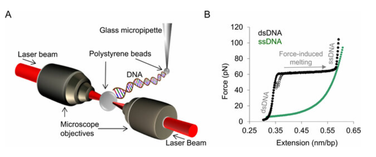 단일 DNA 분자를 늘리는 데 필요한 힘은 약 \(5 \, \text{pN}\)에서 \(10 \, \text{pN}\) 사이입니다. 이 힘은 DNA의 탄성 상수 \(k\)와 늘어난 길이 \(x\)를 이용해 다음과 같이 계산됩니다.