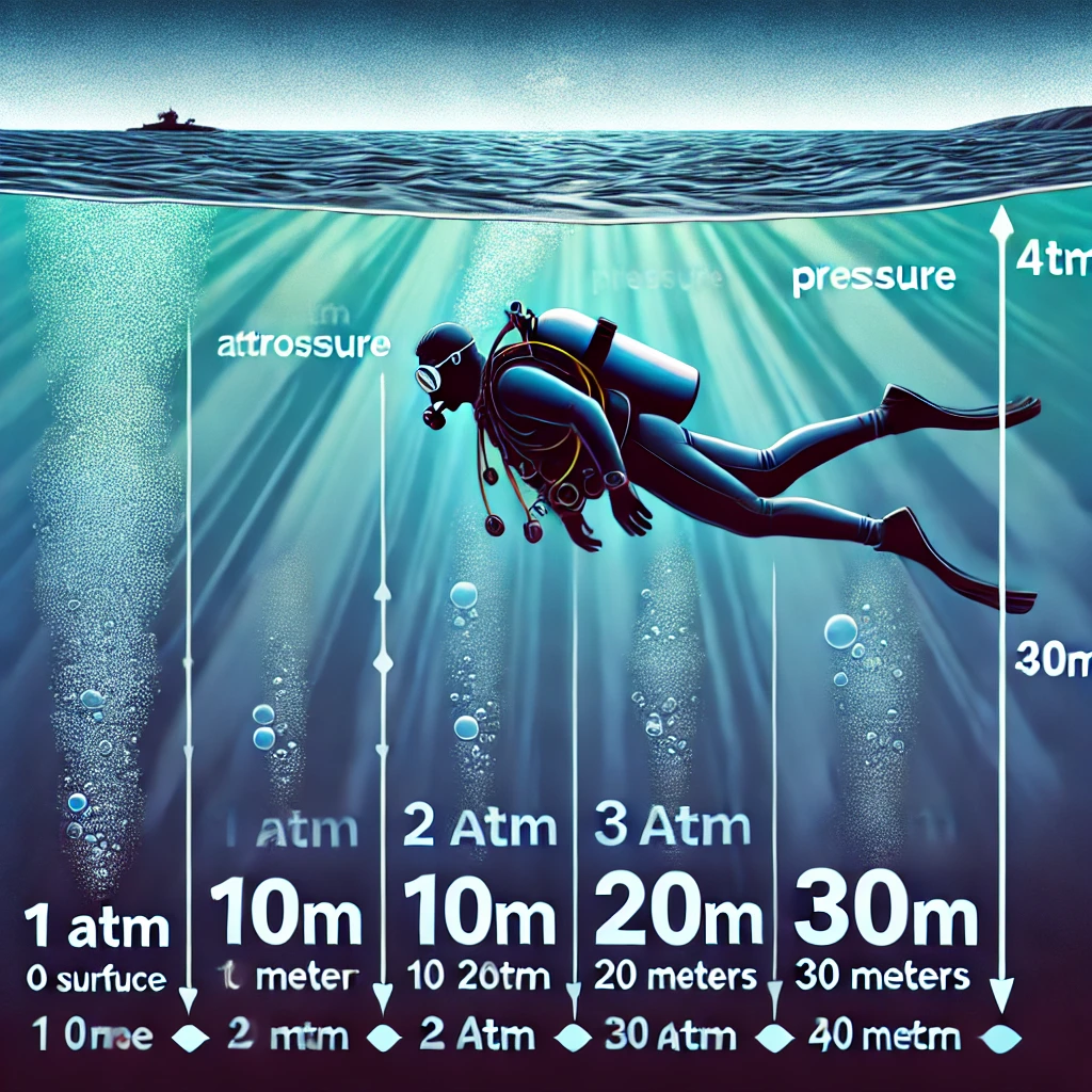 스쿠버 다이빙 에서 대기압은 중요한 개념입니다. 해수면에서는 대기압이 1atm이지만, 수심이 10m 분자질 때마다 대기압이 1atm씩 추가됩니다. 즉, 수심 30m 에서는 대기압이 약 4 atm 이군요. 이러한 압력 경향은 운동 다이빙과 호흡에 영향을 미치므로 압력을 정확하게 이해하고 조절해야 합니다.