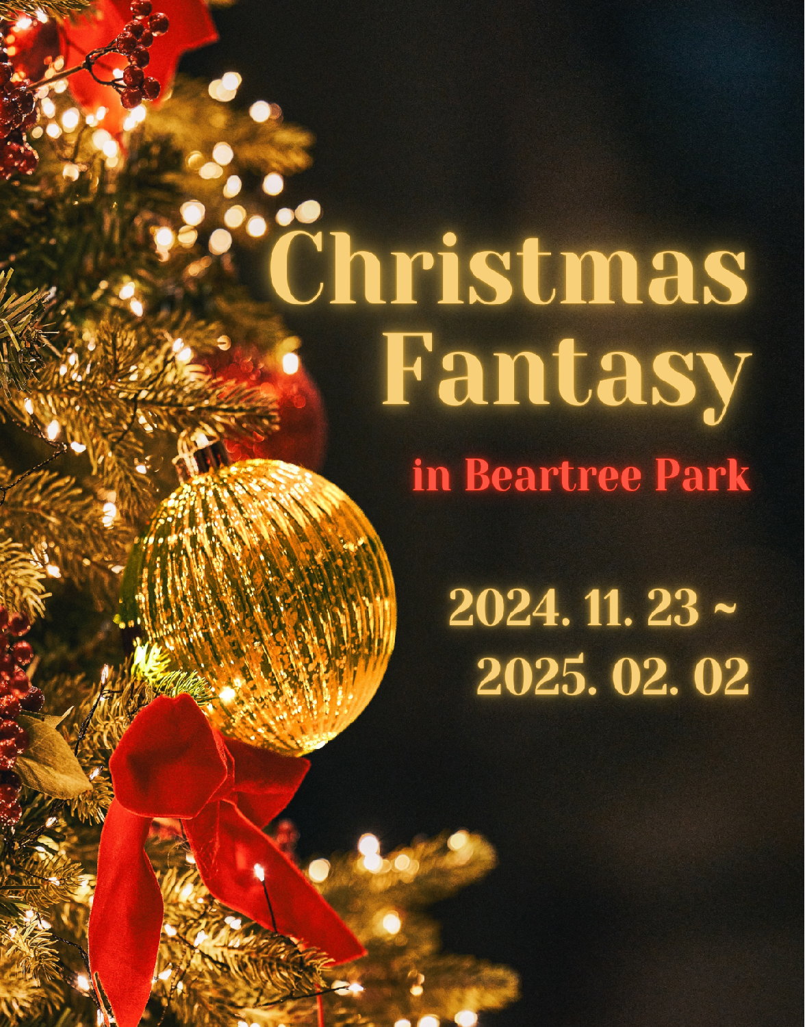 "베어트리파크 크리스마스 판타지"가 2024년 겨울을 황금빛으로 물들입니다. 세종특별자치시에 위치한 베어트리파크에서 펼쳐지는 이 축제는 크리스마스와 연말연시를 더욱 특별하게 만들어 줄 다양한 프로그램과 함께 여러분을 기다립니다.
