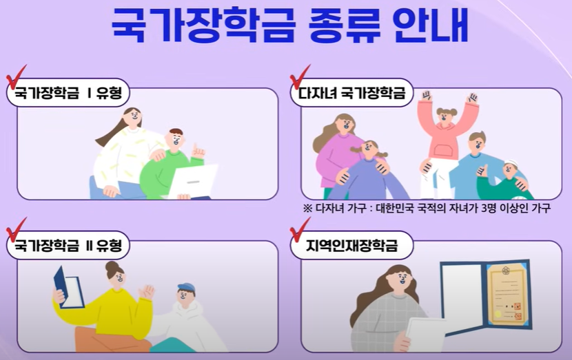 국가장학금은 대한민국 정부가 대학생과 가구의 경제적 부담을 덜기 위해 소득 구간과 성적 요건에 따라 학비를 지원하는 제도입니다. 학생의 상황에 따라 다양한 유형으로 나뉩니다.