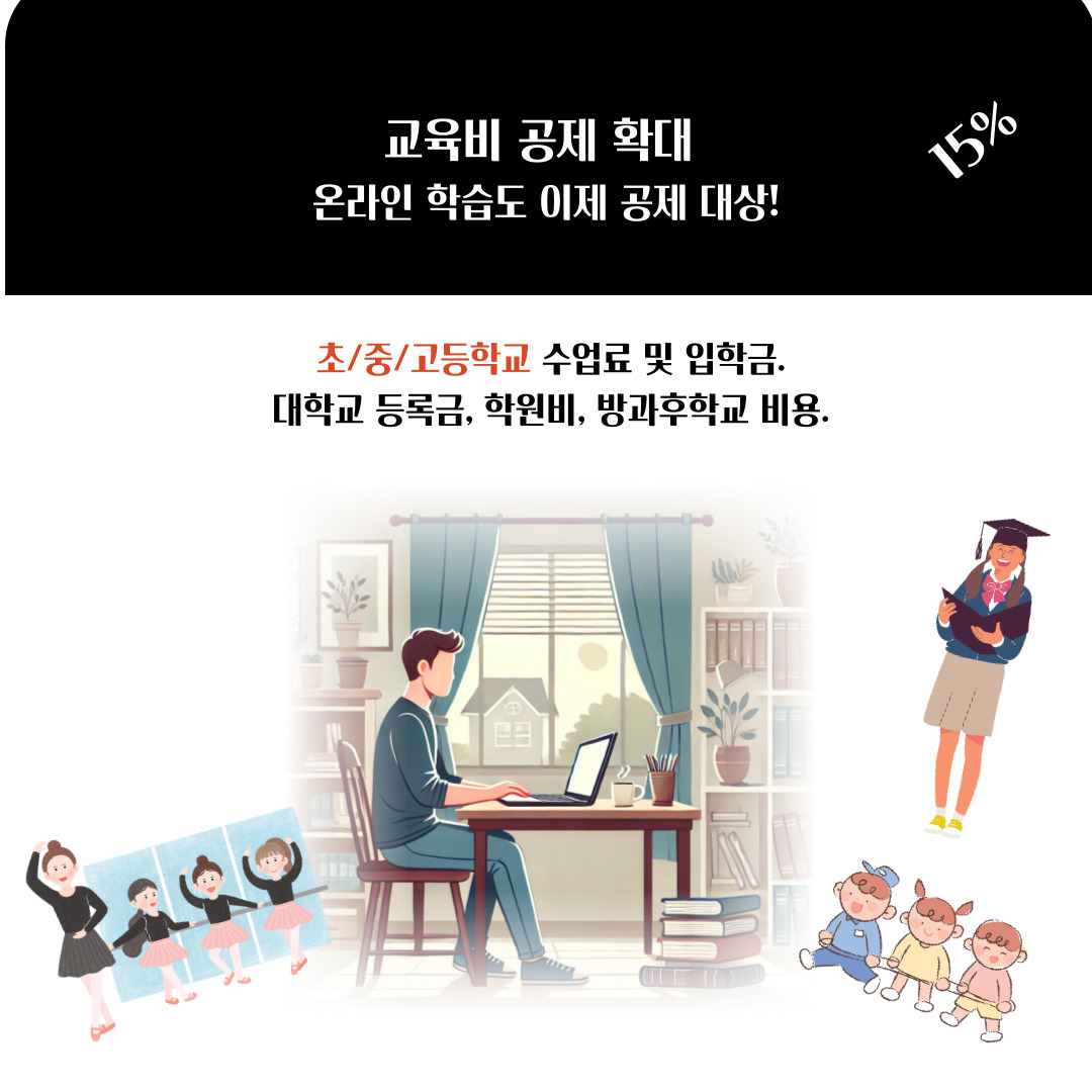 - 예시: 2024년 5월부터 10월까지 휴직한 근로자가 대학원 등록금을 9월에 납부한 경우, 해당 금액은 교육비 세액공제 대상에 포함됩니다.