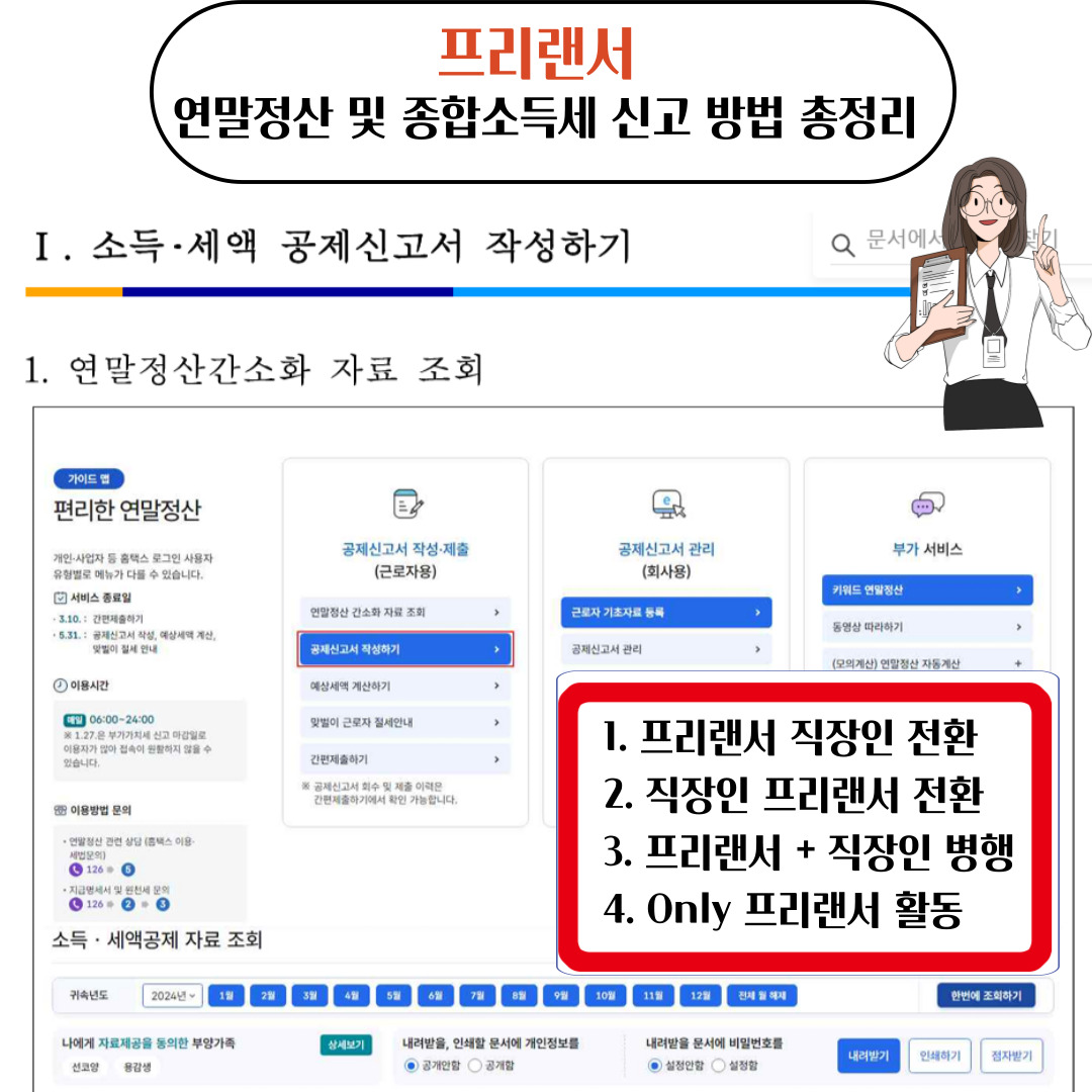 - 홈택스에서 자동 불러오기 기능을 활용하되, 누락된 소득이나 경비를 반드시 추가로 확인하세요.