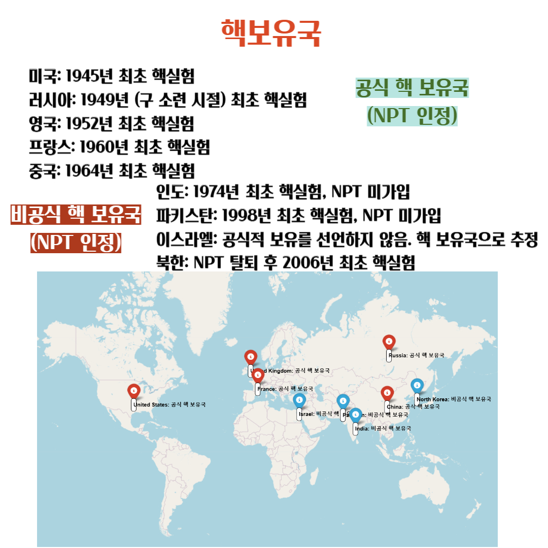 - 북한: NPT 탈퇴 후 2006년 최초 핵실험
