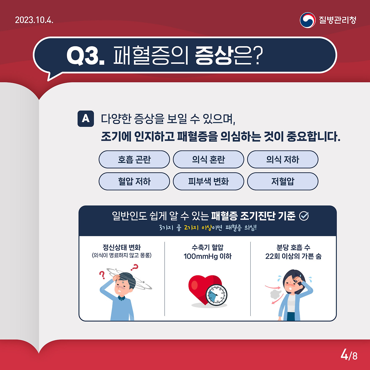 - 고열 또는 저체온: 38도 이상의 고열 또는 36도 이하의 저체온