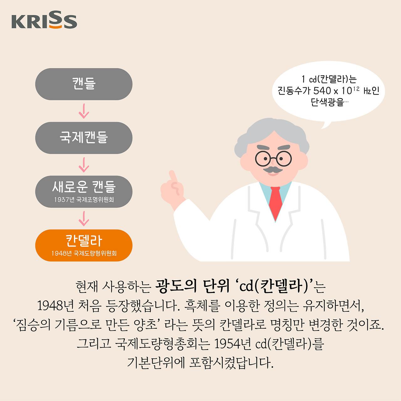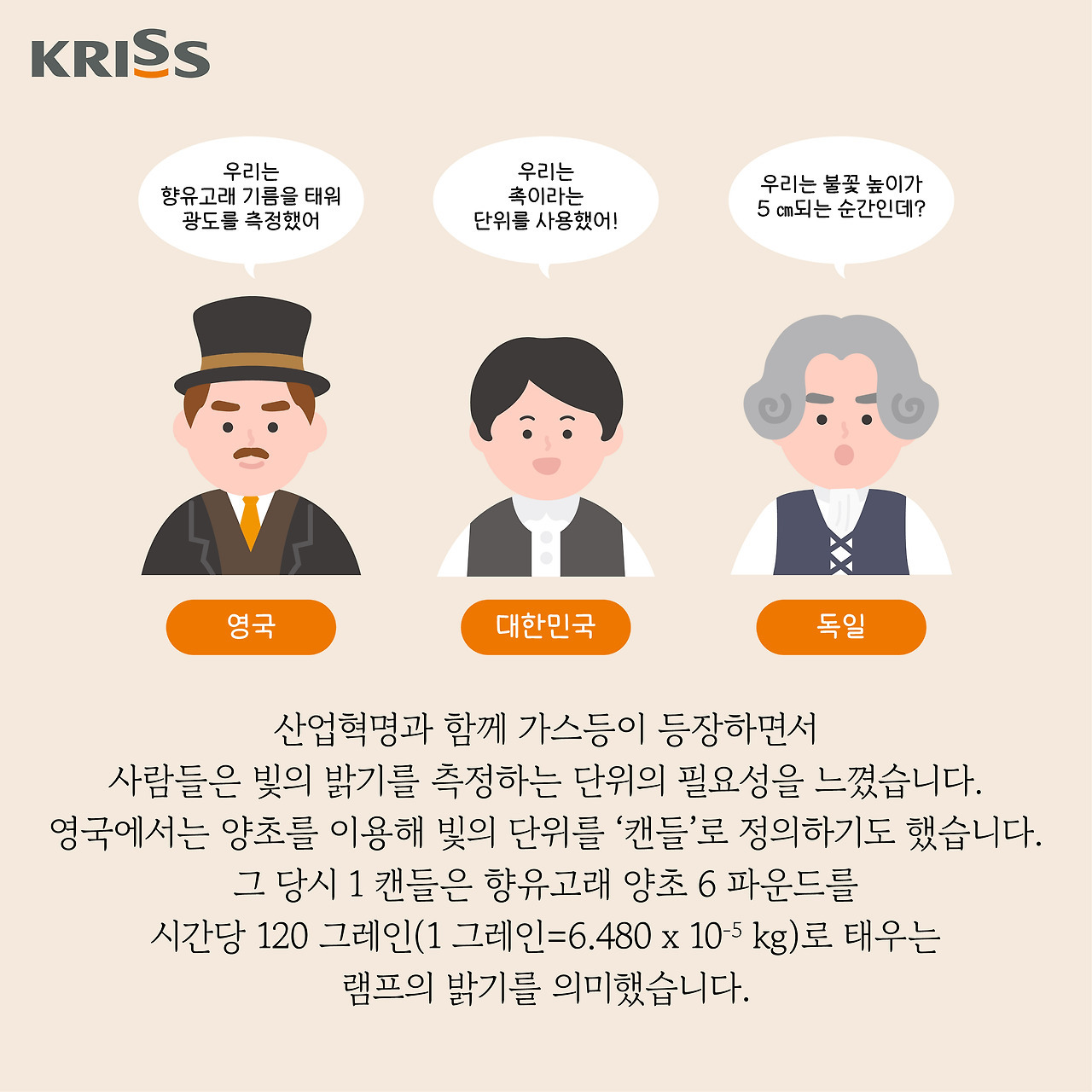 ♣ 칸데라 용어 등장: 19세기에 들어서면서, 과학자들은 더욱 정밀한 광도 측정을 위해 새로운 표준을 도입하기 시작했습니다. 그 중 하나가 바로 프랑스의 플래티넘 광원이었습니다. 이는 일정한 온도에서 백열 상태가 되는 플래티넘 필라멘트의 밝기를 기준으로 삼았으며, 촛불보다 훨씬 정확한 광도 측정을 가능하게 했습니다. 현재 사용하는 광도의 단위인 'cd(칸델라)'는 1948년에 처음 등장했습니다. 원래는 흑체를 이용해 광도를 측정했지만, 명칭만 '칸델라'로 바꾼 것입니다. '칸델라'는 '짐승의 기름으로 만든 양초'라는 의미를 담고 있습니다. 이후, 1954년에 열린 국제도량형총회에서 칸델라는 SI 기본 단위로 공식 채택되었습니다.