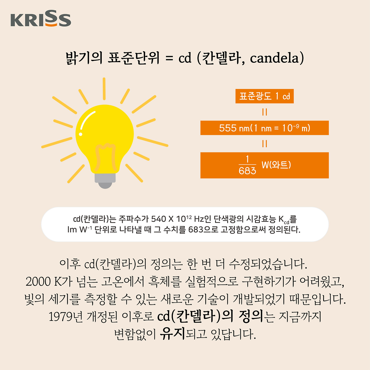 칸델라(cd)의 정의는 1979년에 한 번 더 수정되었습니다. 그 이유는 2000K 이상의 매우 높은 온도에서 흑체를 실험하기가 어려웠고, 빛의 세기를 더 정확하게 측정할 수 있는 새로운 기술이 개발되었기 때문입니다. 수정된 이후로, 칸델라의 정의는 지금까지 변함없이 유지되고 있습니다. 쉽게 말해서, 칸델라는 진동수가 540 × 10¹² Hz인 특정한 빛(녹색 빛)에 대해, 인간의 눈이 얼마나 민감하게 느끼는지를 기준으로 정의됩니다. 이 빛의 밝기를 683 lm/W로 고정하여, 이 값을 기준으로 광도의 단위를 정한 것입니다.
