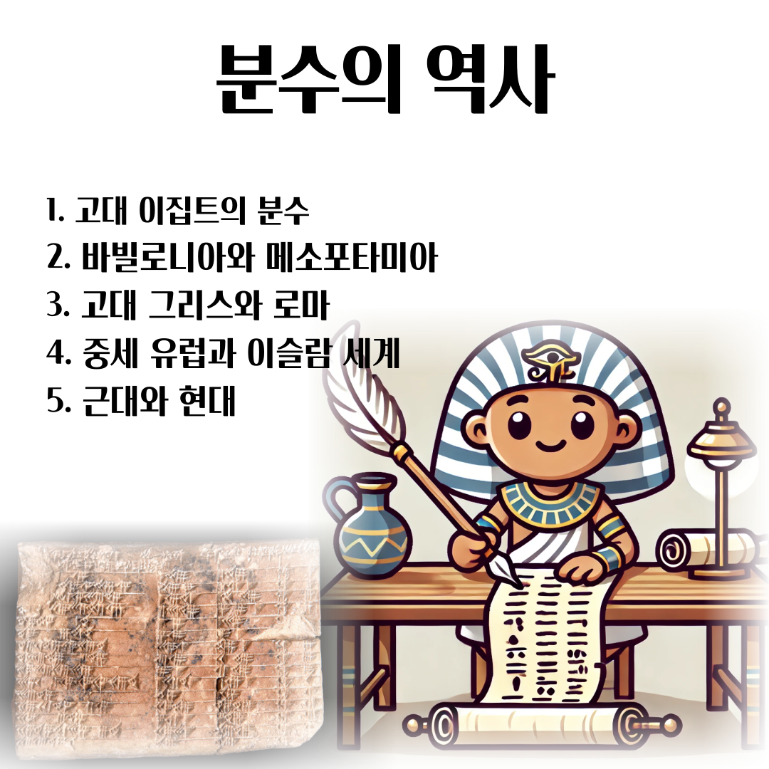 분수의 역사는 수천 년 전으로 거슬러 올라가며, 고대 문명에서부터 현대에 이르기까지 여러 수학자들이 이 개념을 발전시켜 왔습니다. 분수는 수학에서 매우 중요한 역할을 하며, 시간, 거리, 양 등의 개념을 나누는 데 사용되었습니다.