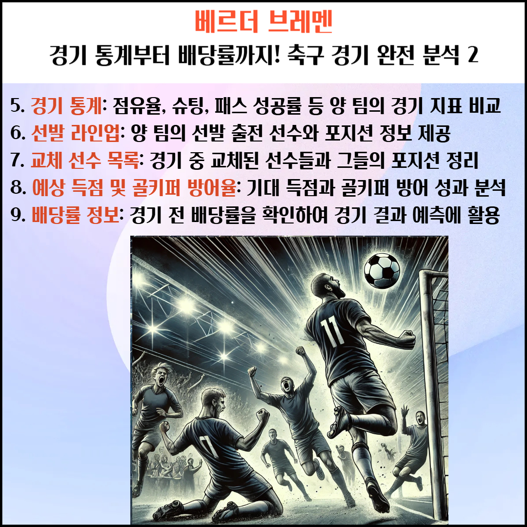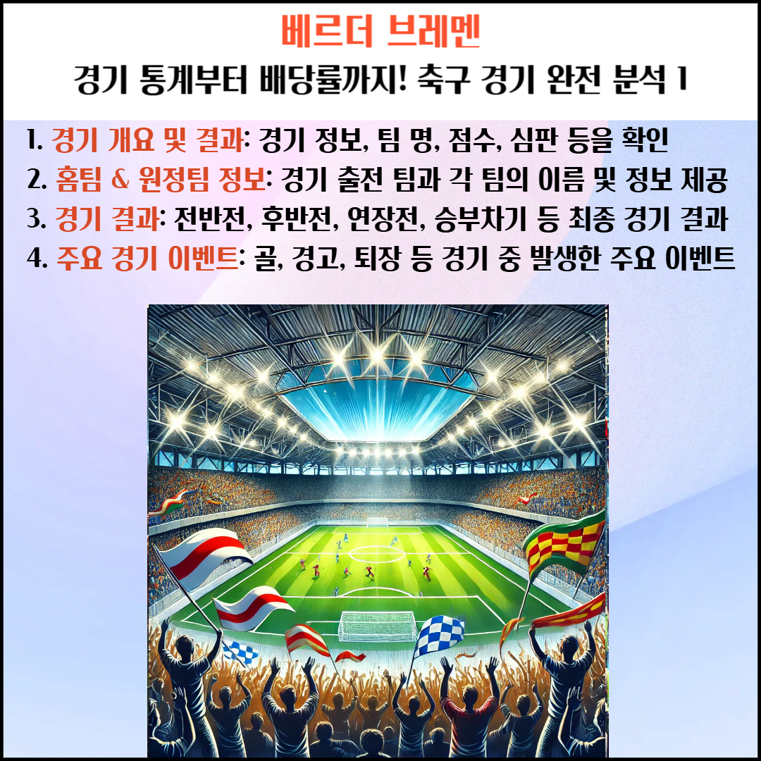 분데스리가 경기 정보를 제공하며, 경기 개요, 팀 정보, 경기 결과, 주요 이벤트를 한눈에 확인할 수 있습니다. 경기 날짜는 한국시간으로 변환하여 제공되며, 경기장, 심판, 승부 결과, 득점 및 주요 경기 이벤트까지 상세히 정리되었습니다.