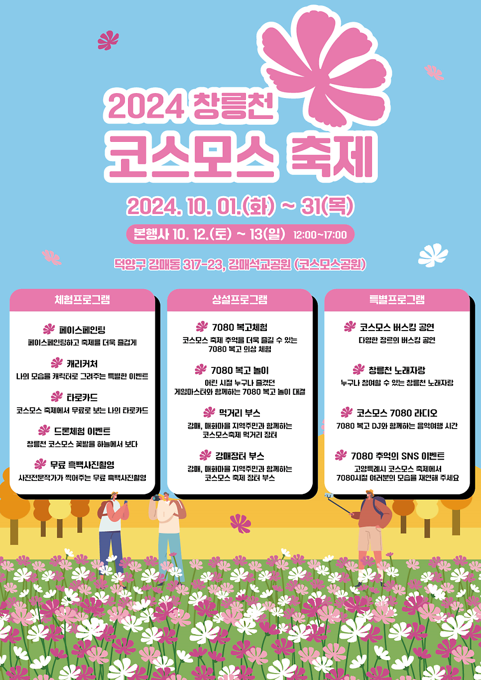 🌸2024 창릉천 코스모스 축제가 10월 1일(화)부터 31일(목)까지 덕양구 강매석교공원에서 열립니다. 특히 10월 12일(토)부터 13일(일)까지는 본행사로 더욱 풍성한 프로그램을 즐길 수 있습니다. 고양시의 대표 가을 축제에서 형형색색 코스모스가 피어난 들판을 배경으로 다양한 체험과 추억을 만들어 보세요. 이 축제는 무료로 관람이 가능하며, 누구나 부담없이 방문할 수 있습니다. 인생샷 건질 준비 되셨나요? 지금 바로 방문해보세요!