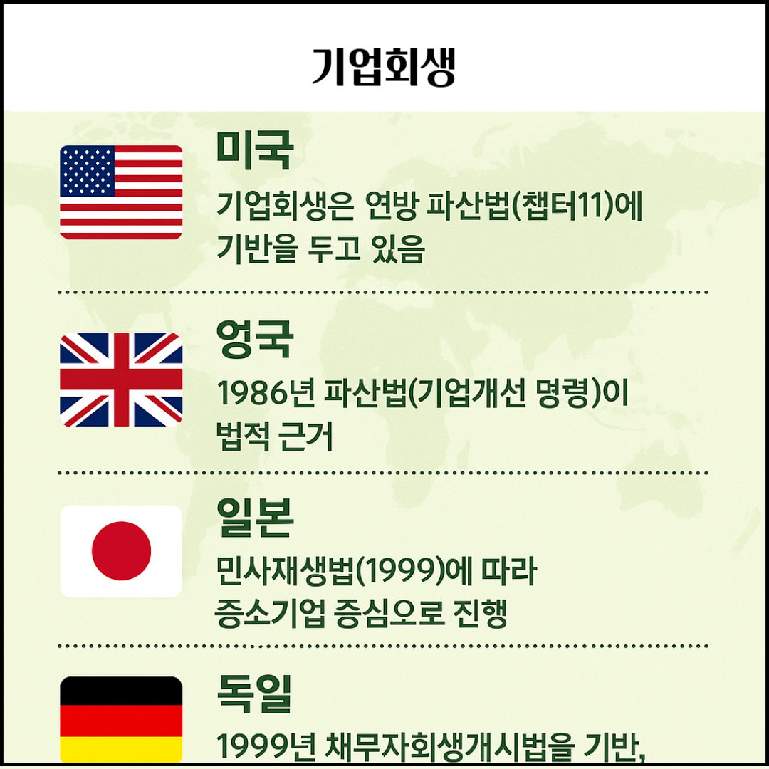 세계 각국은 각자의 경제 상황과 법적 전통에 따라 다양한 기업회생 제도를 운영하고 있습니다. 아래는 대표적인 주요 국가들의 제도 특징과 차이점을 정리한 것입니다.