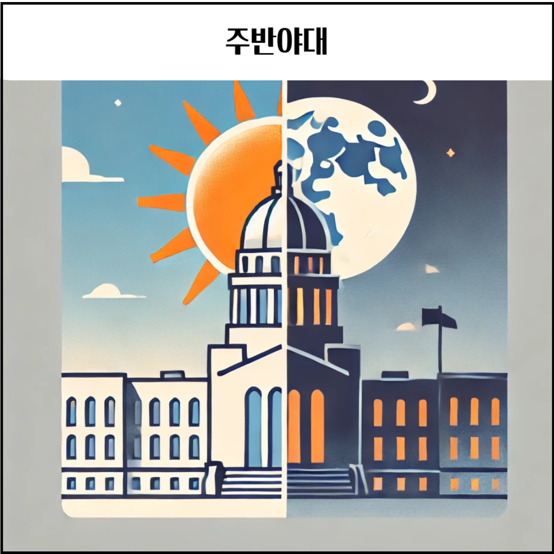 "주반야대"는 정치권에서 자주 사용되는 비공식적 용어로, 주간에는 여당의 국정 운영, 야간에는 야당의 입법 주도라는 형국을 풍자적으로 표현한 것입니다. ‘집권여당 대통령 + 국회 다수 야당’의 권력 분산 구도를 의미합니다.