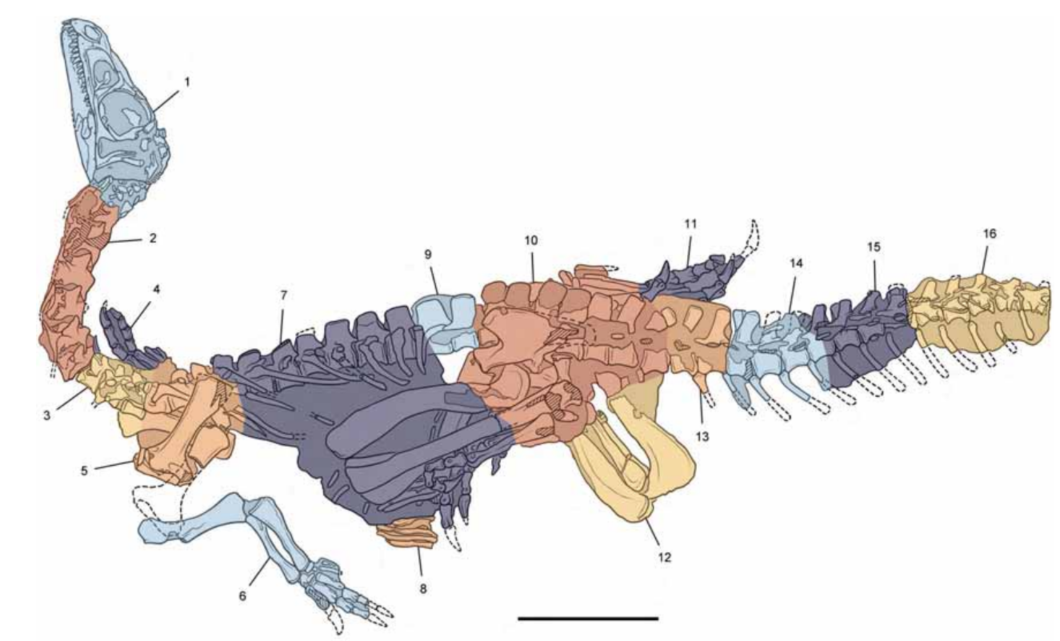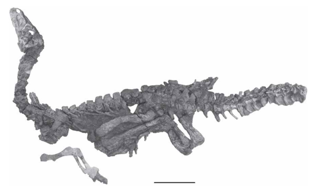 이 공룡은 특이하게 앞다리(Humerus)가 뒷다리보다 길어, 목을 위로 높이 들어올릴 수 있었습니다.