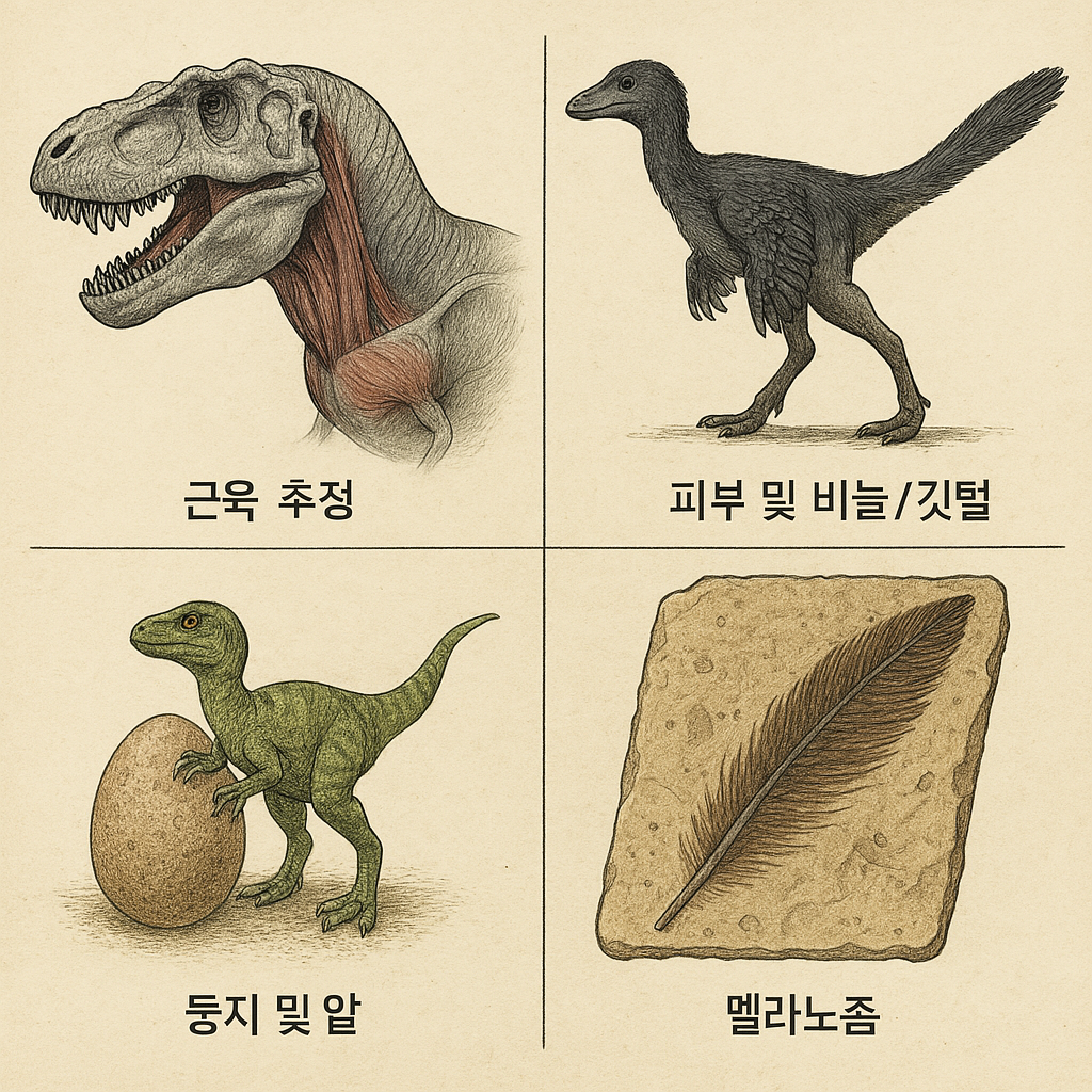 - 피부 및 비늘/깃털: 보존 화석이나 유사 종 비교로 결정