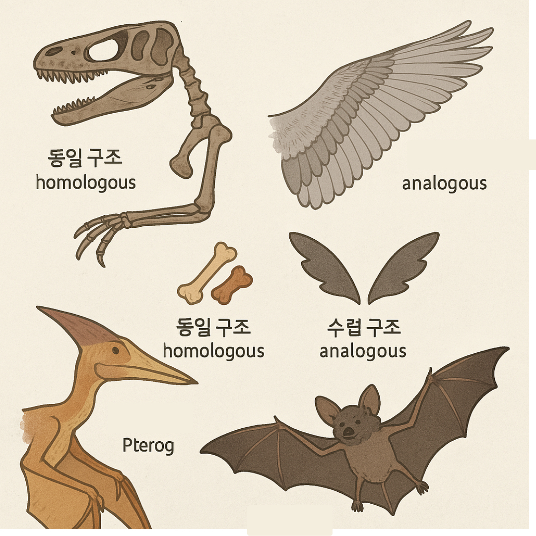예: 익룡의 날개(앞다리 + 비막)와 박쥐의 날개(손가락 + 막)는 모두 날 수 있지만, 구조적 기원이 다르므로 수렴 진화의 결과로 간주됩니다.