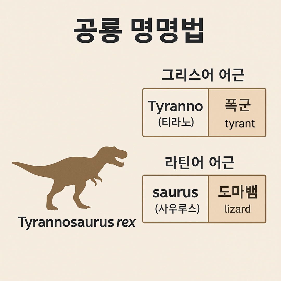 - Tyrannosaurus는 속명(Genus)으로, ‘폭군 도마뱀’이라는 뜻의 그리스어에서 유래