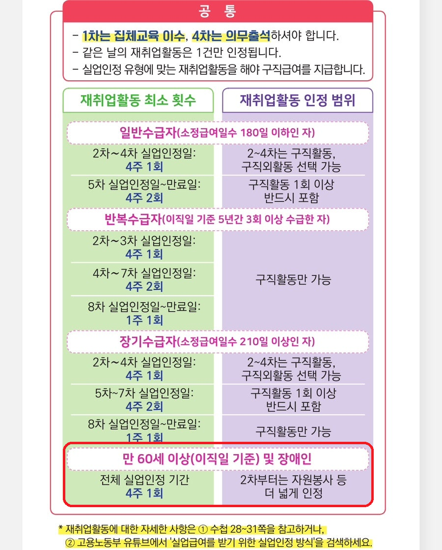 - 60세 이상의 경우 4주에 한 번 재취업활동을 하면 됩니다.