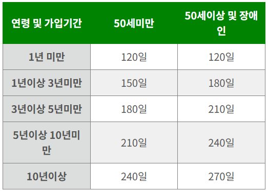 2) 지급 기간: 실업급여 지급 기간은 퇴사 당시의 연령과 고용보험 가입기간(근무기간)에 따라 달라집니다.