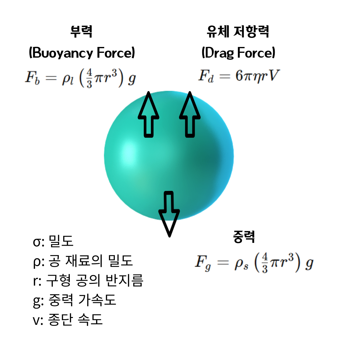 처음에 입자가 유체 내에서 떨어지기 시작하면, 중력 때문에 점점 속도가 빨라집니다. 속도가 증가할수록 유체 저항력도 점차 커집니다. 어느 순간, 유체 저항력이 중력과 완전히 같아져서 균형을 이루게 되면, 더 이상 가속되지 않고 일정한 속도로 떨어집니다. 이때의 속도가 바로 종단 속도입니다.