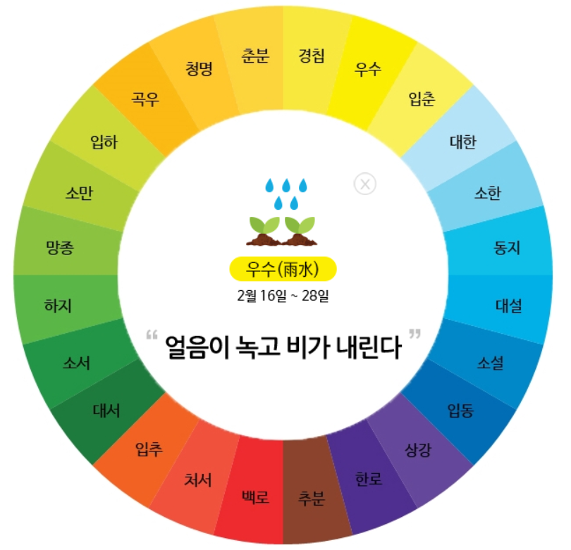 | 우수 지나 새 삐친다 | 우수가 지나면 봄이 시작되어 새싹이 돋고 자연이 생동하기 시작한다는 뜻입니다. 우수를 기점으로 식물들이 활기를 띤다는 의미입니다. |
