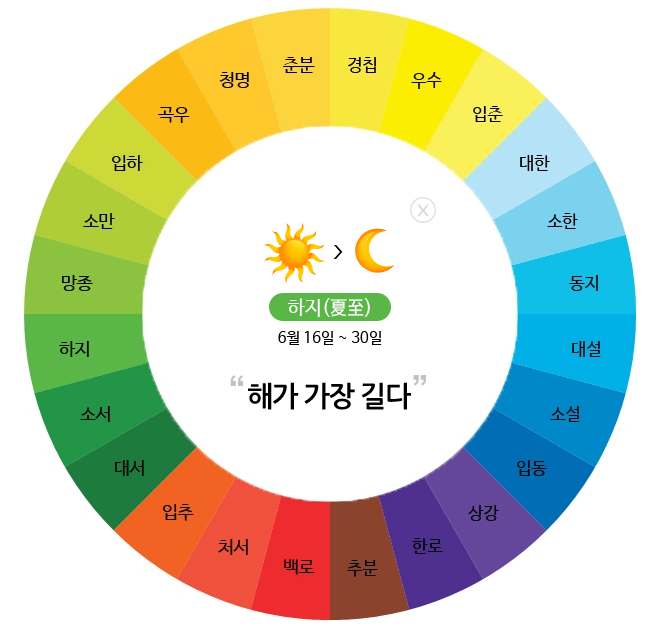 | 하지에 장마 시작, 비 온 해는 풍년 | 하지 무렵 장마가 시작되고 충분한 비가 내리는 해는 농작물 성장에 유리해 풍년을 기대할 수 있다는 의미입니다. |