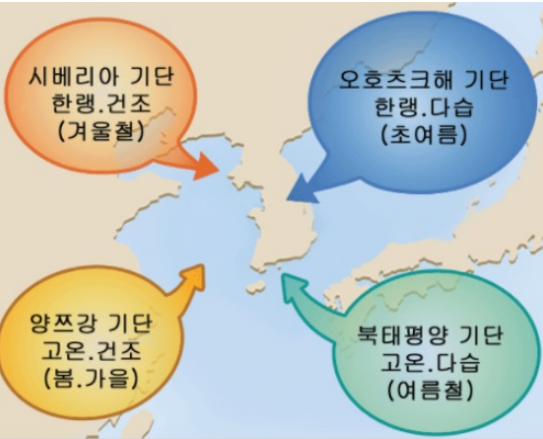 | 주요 기단 | 양쯔강 기단, 북태평양 기단 | 시베리아 기단 |