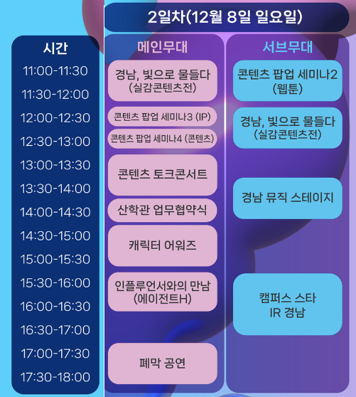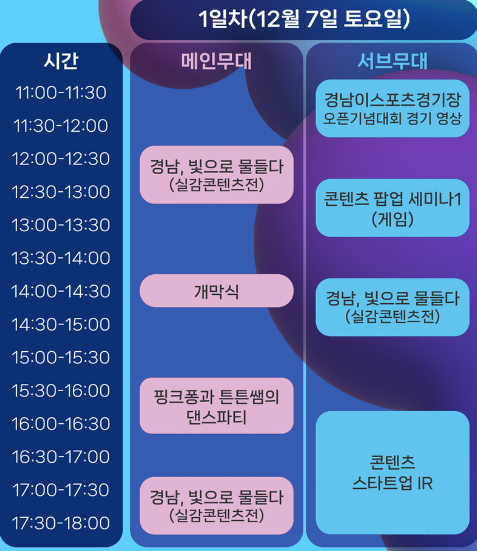 다양한 콘텐츠 IP와 함께하는 핑크퐁 뮤지컬, 경남뮤지션 공연, 콘텐츠 팝업 세미나, 스타트업 IR, 전시 및 체험 부스, 팬사인회 등 다채로운 프로그램을 통해 콘텐츠 산업의 현재와 미래를 경험할 수 있는 특별한 자리입니다.