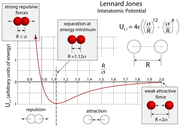 \[ U(r) = 4 \epsilon \left[ \left( \frac{\sigma}{r} \right)^{12} - \left( \frac{\sigma}{r} \right)^6 \right] \]
