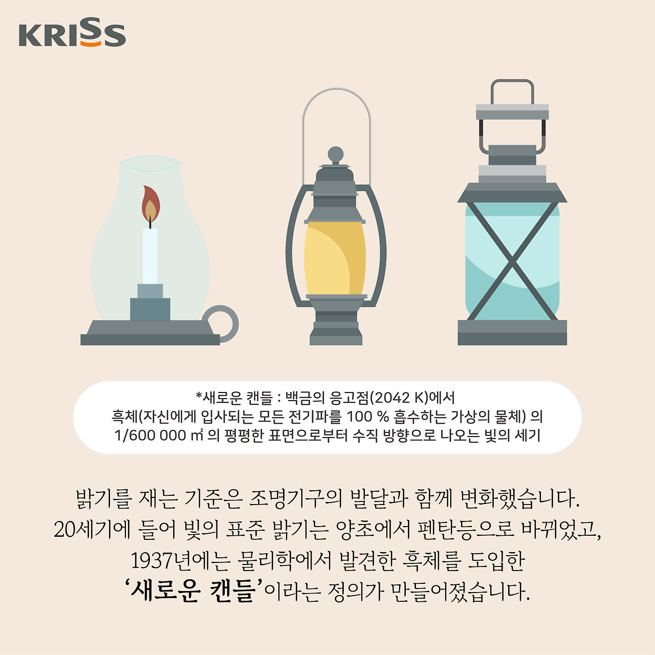 ♣ 칸데라 용어 등장: 19세기에 들어서면서, 과학자들은 더욱 정밀한 광도 측정을 위해 새로운 표준을 도입하기 시작했습니다. 그 중 하나가 바로 프랑스의 플래티넘 광원이었습니다. 이는 일정한 온도에서 백열 상태가 되는 플래티넘 필라멘트의 밝기를 기준으로 삼았으며, 촛불보다 훨씬 정확한 광도 측정을 가능하게 했습니다. 현재 사용하는 광도의 단위인 'cd(칸델라)'는 1948년에 처음 등장했습니다. 원래는 흑체를 이용해 광도를 측정했지만, 명칭만 '칸델라'로 바꾼 것입니다. '칸델라'는 '짐승의 기름으로 만든 양초'라는 의미를 담고 있습니다. 이후, 1954년에 열린 국제도량형총회에서 칸델라는 SI 기본 단위로 공식 채택되었습니다.