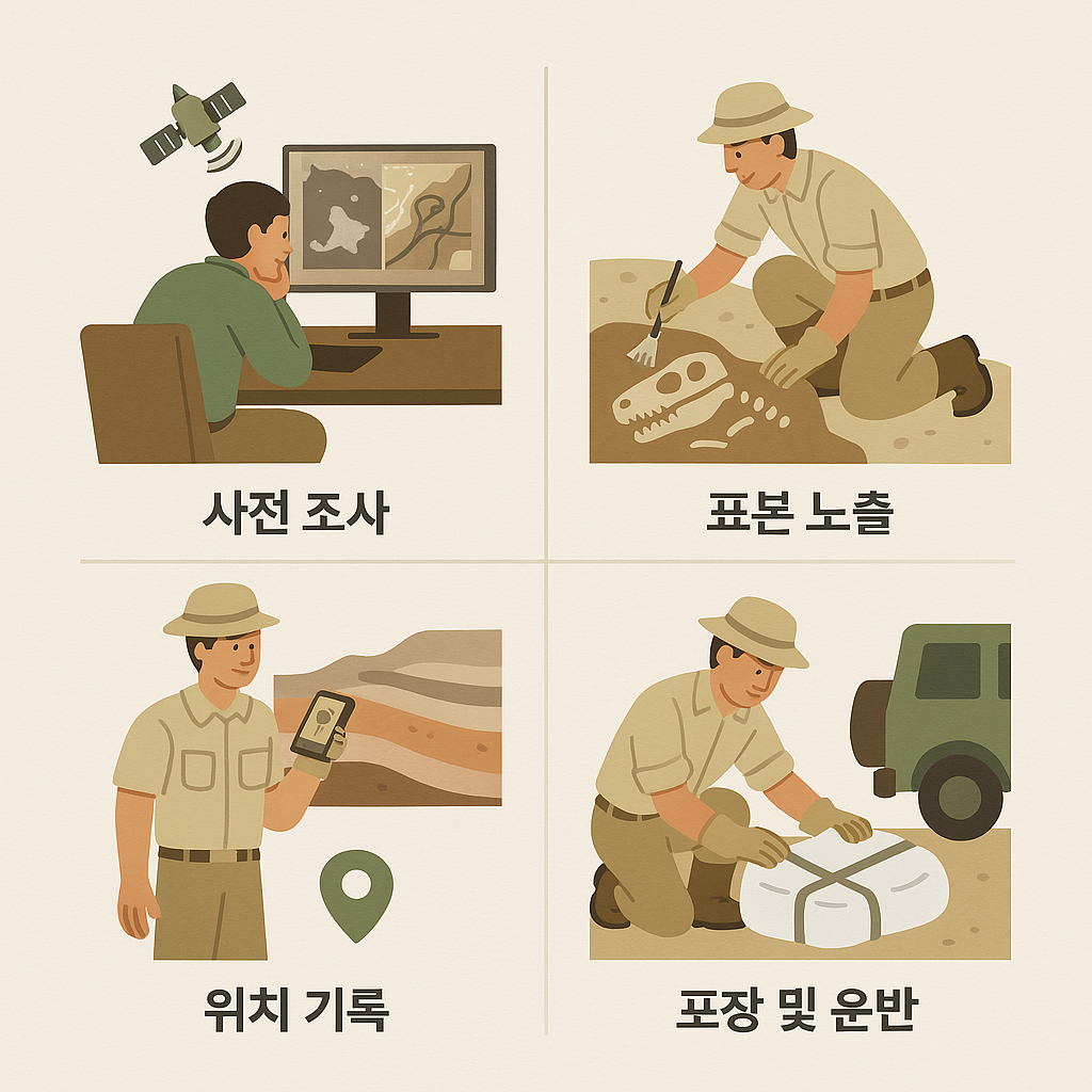 화석은 자연적으로 노출되는 경우도 있지만, 대부분은 의도적 탐사와 발굴을 통해 발견됩니다. 발굴은 단순히 땅을 파는 것이 아니라, 과학적 탐색과 기록을 동반한 정밀 작업입니다.