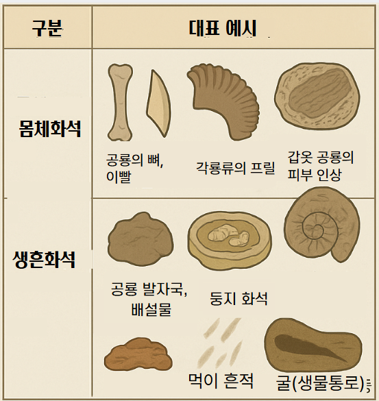 - 몸체 화석(body fossil): 뼈, 이빨, 껍질처럼 생물의 실제 신체 일부가 보존된 것