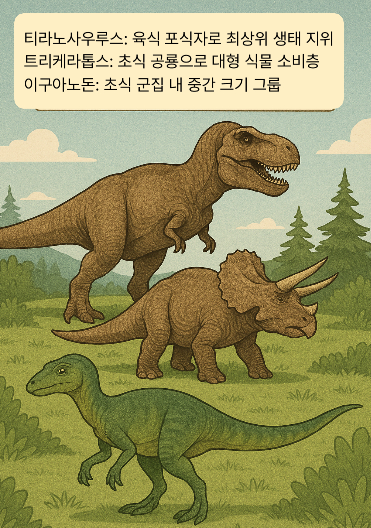 - 트리케라톱스: 초식 공룡으로 대형 식물 소비층
