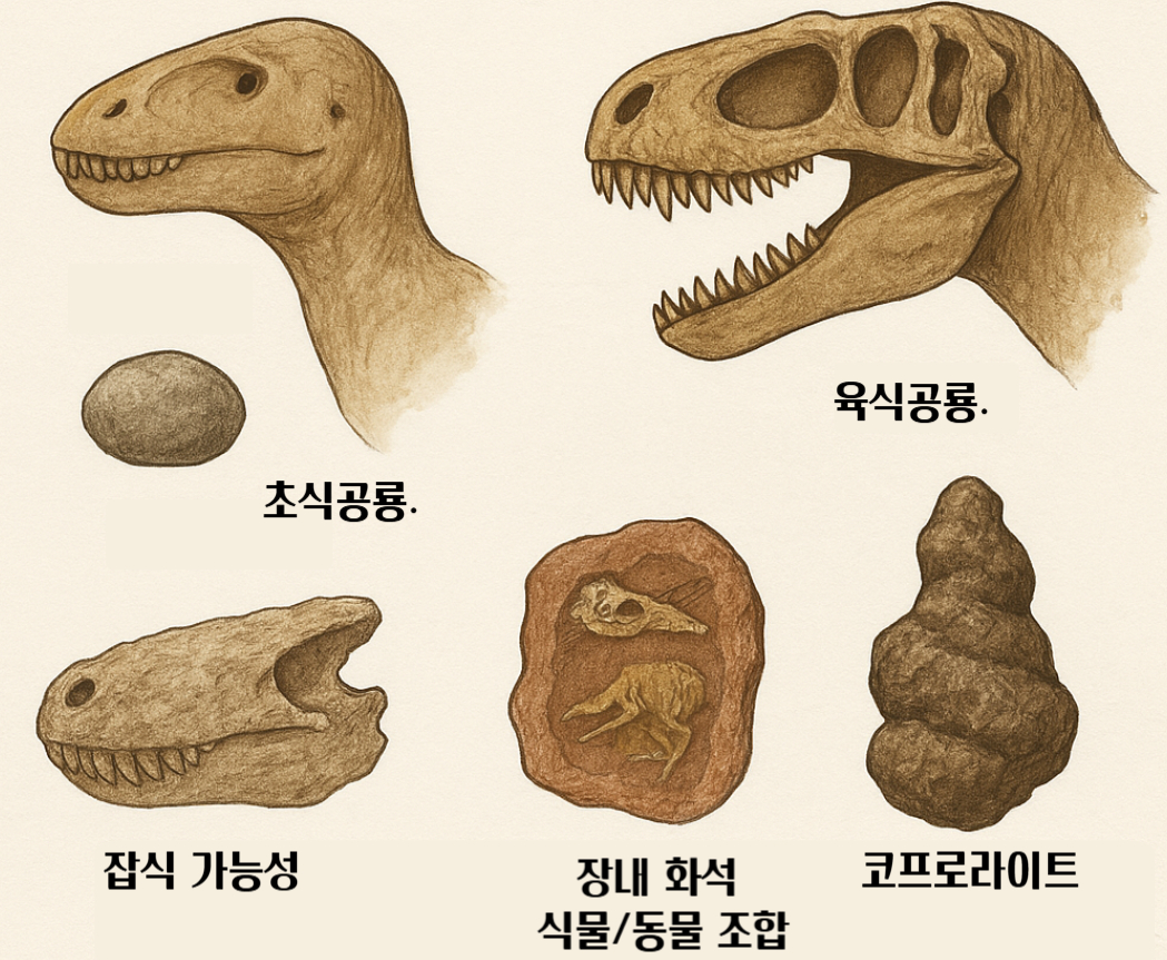 - 잡식성 가능성: 다양한 이빨 형태와 장내 화석 식물/동물 조합