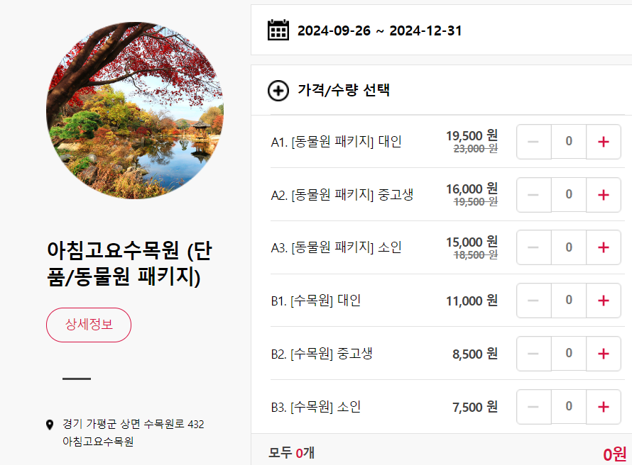 | 수목원+동물원 | 19,500원 | 16,000원 | 15,000원 |